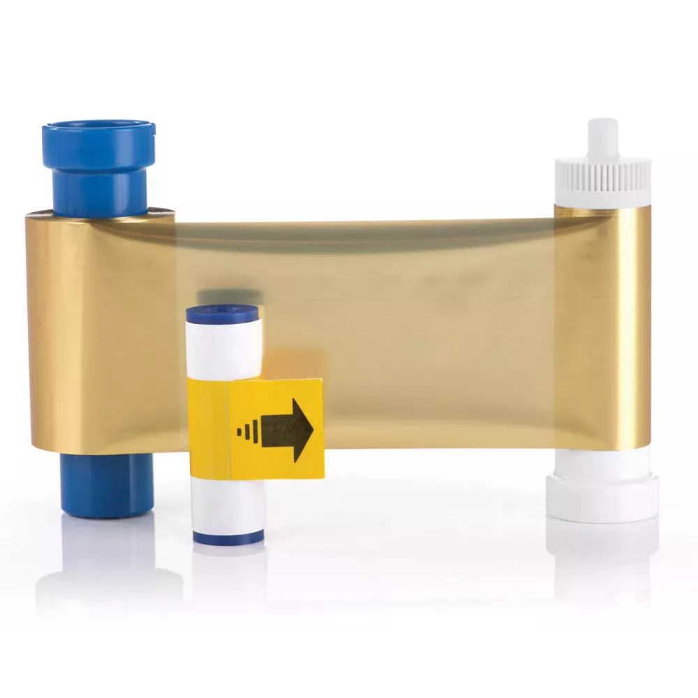 Ce ruban imprime en or. Utile pour repiquer du texte ou un code barre sur une carte avec fond pré-imprimé.